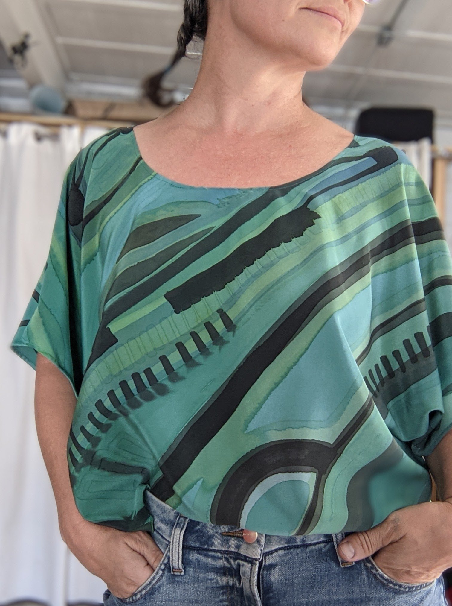 Simple chic tops made of silk. Every single one is unique, just like you. One size (as big as I can make them with one yard of 45" wide silk).